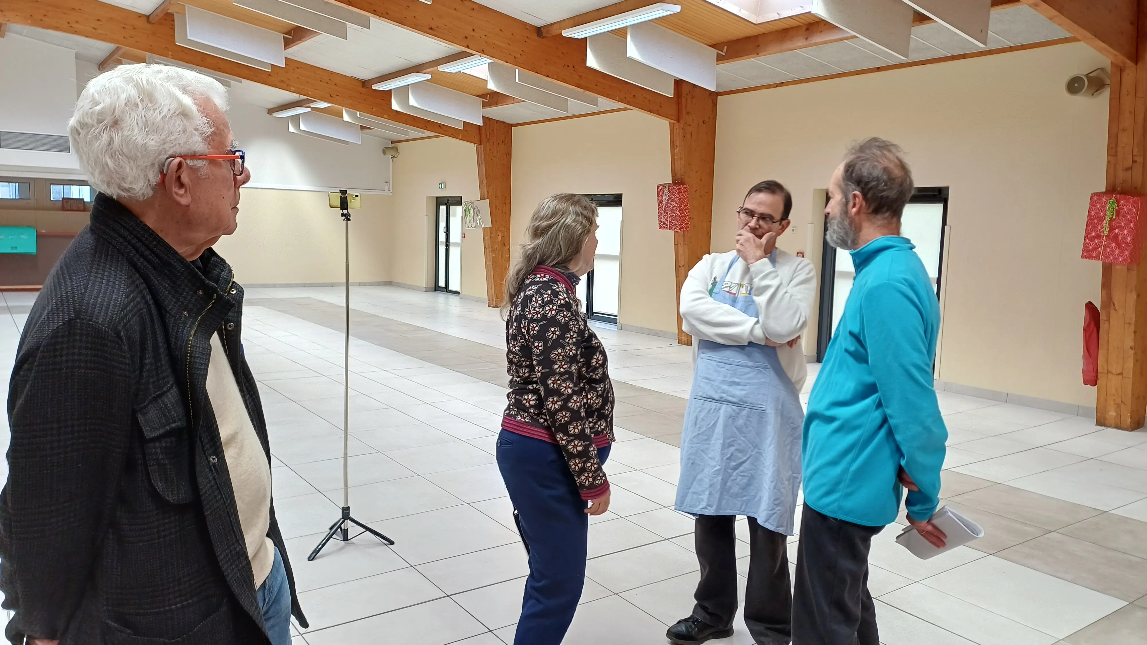 De gauche à droite : Jocelyne dans le rôle de Camille, l'élève attentive et intéressée par les récits pittoresques du vieux marin, Francis dans la peau de Loustic, facétieux et assez agité, Louis, le Capitaine un tantinet ronchon et "légèrement" macho, et enfin Marielle, Mademoiselle Labinocle la maîtresse, souvent exaspérée par ses élèves dissipés.