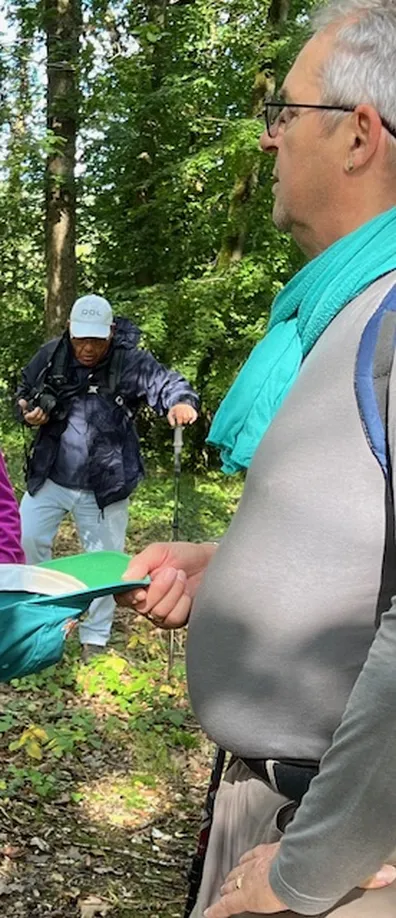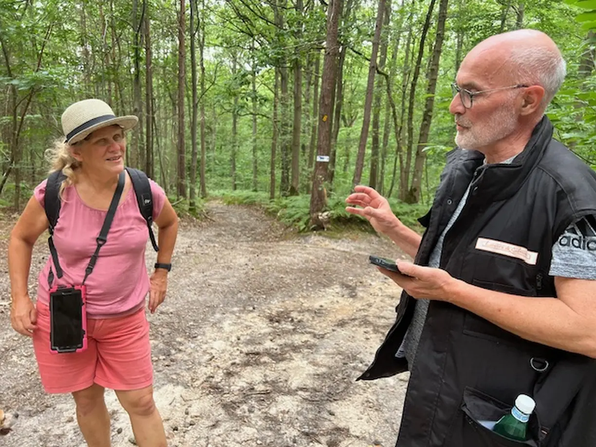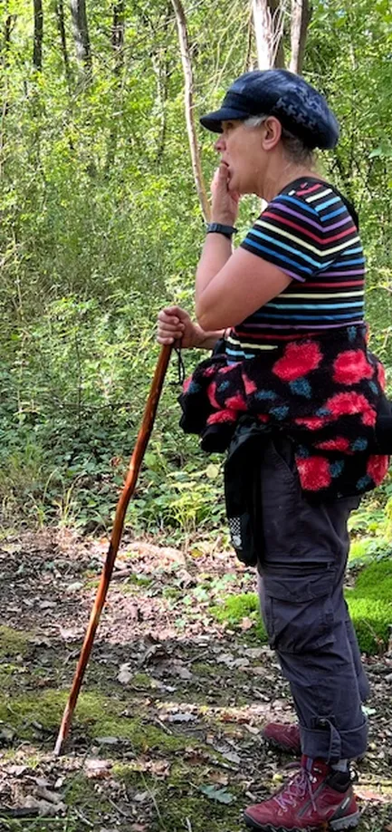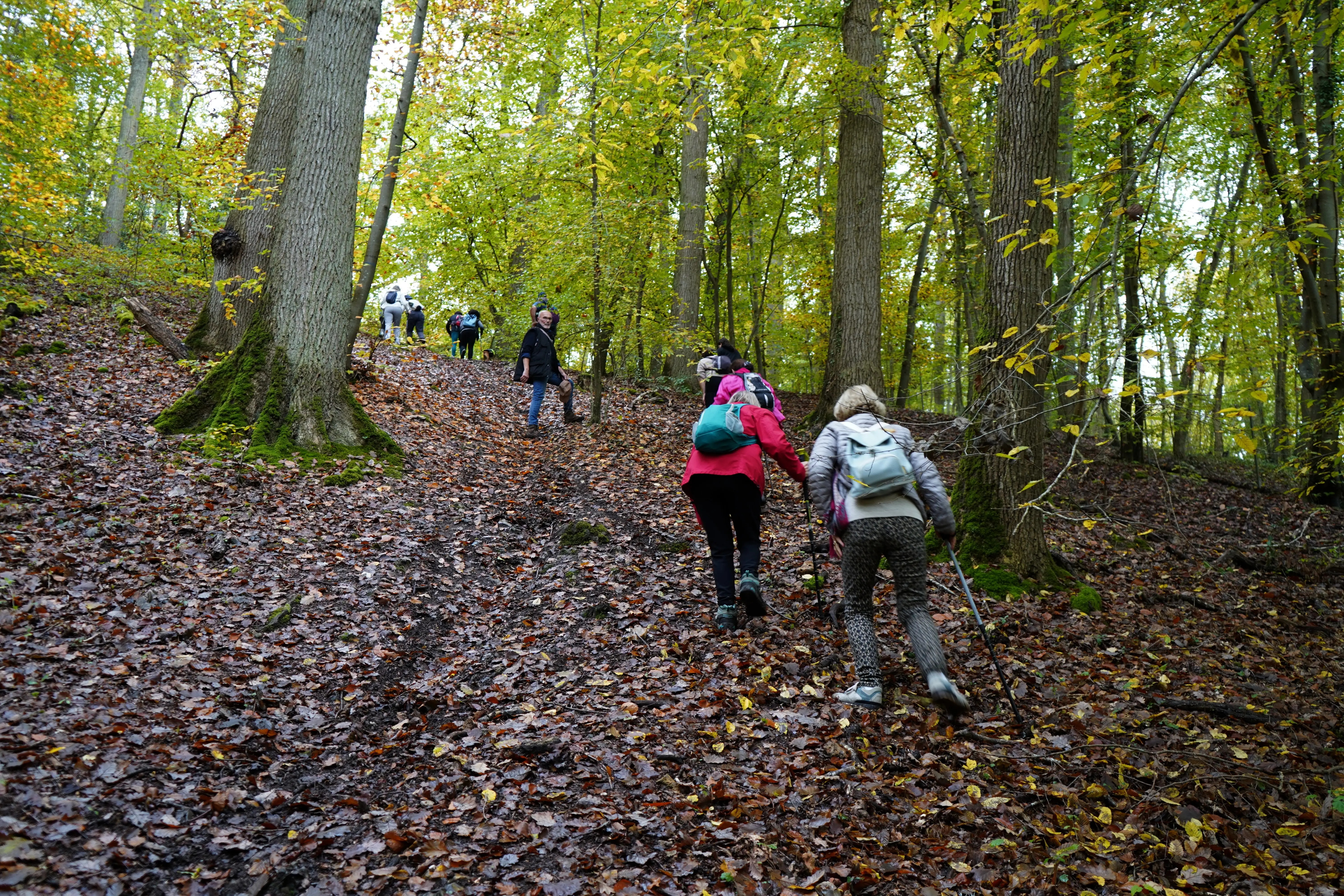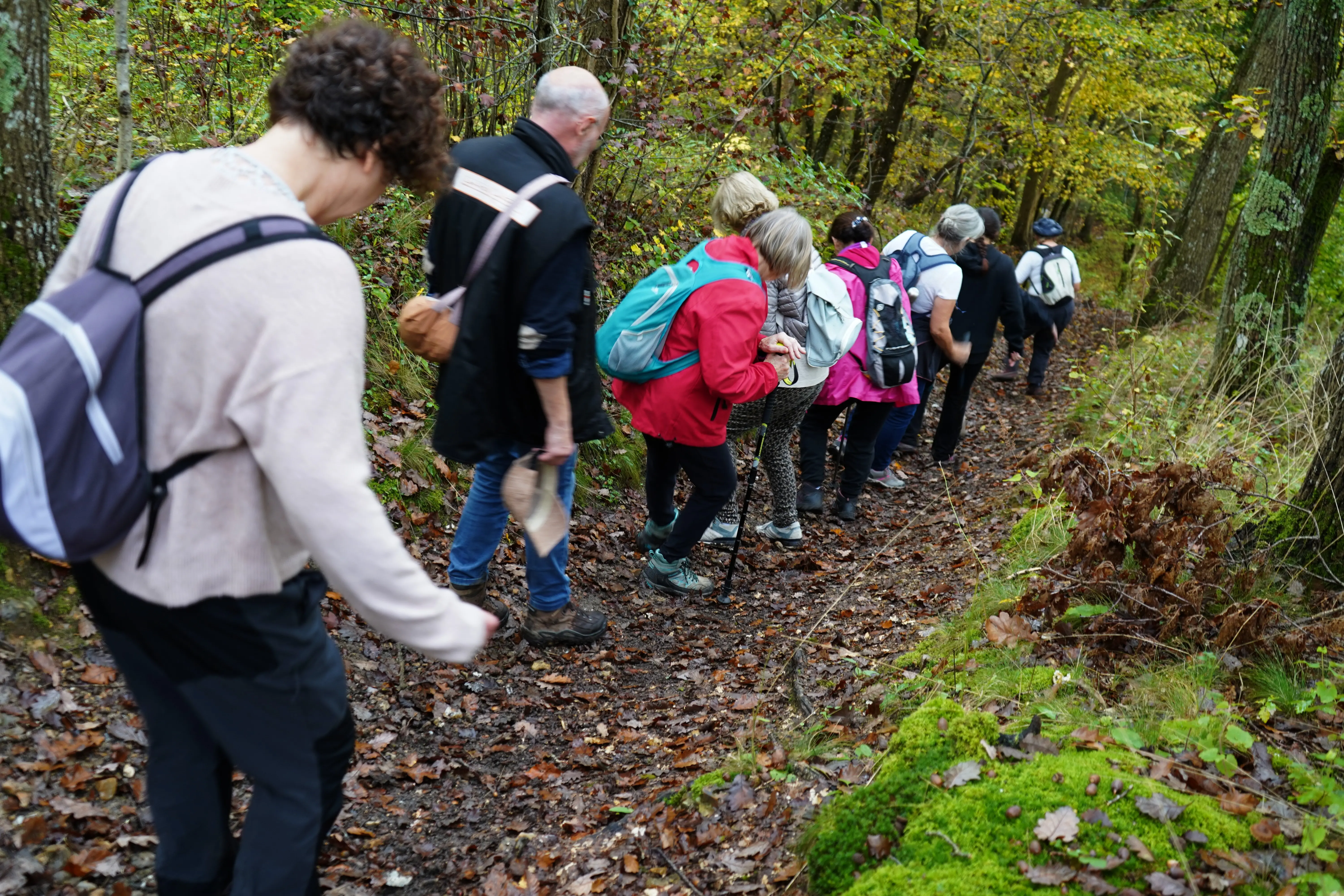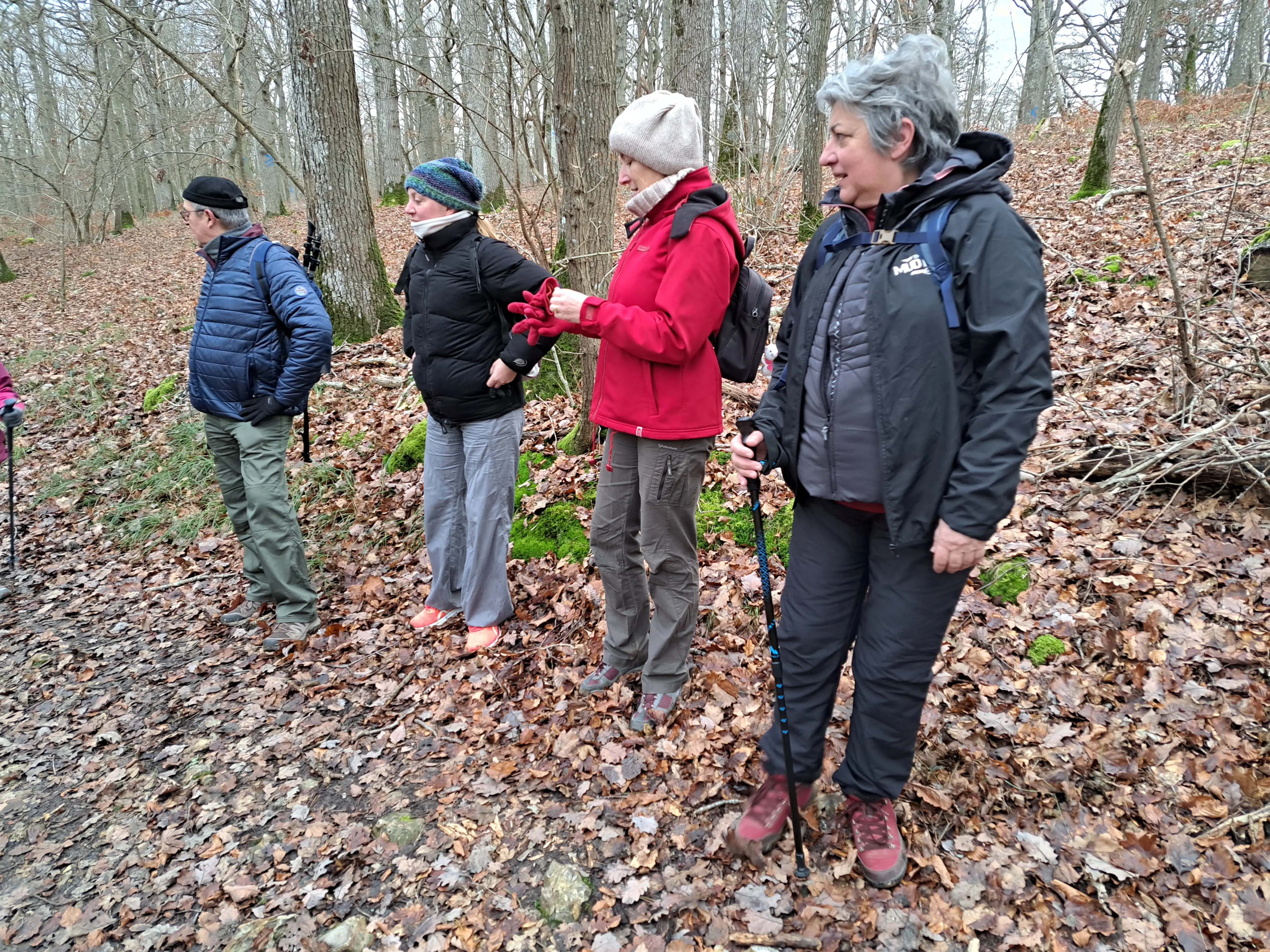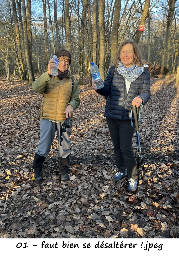 Le petit groupe de marcheurs en forêt d'Epieds mené par Marie-Claire, une descente, une pause bienvenue pour se désaltérer avant une grimpette !